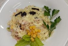 182 г • ветчина, помидор, кукуруза, чернослив, сыр, яйцо, майонез, зелень